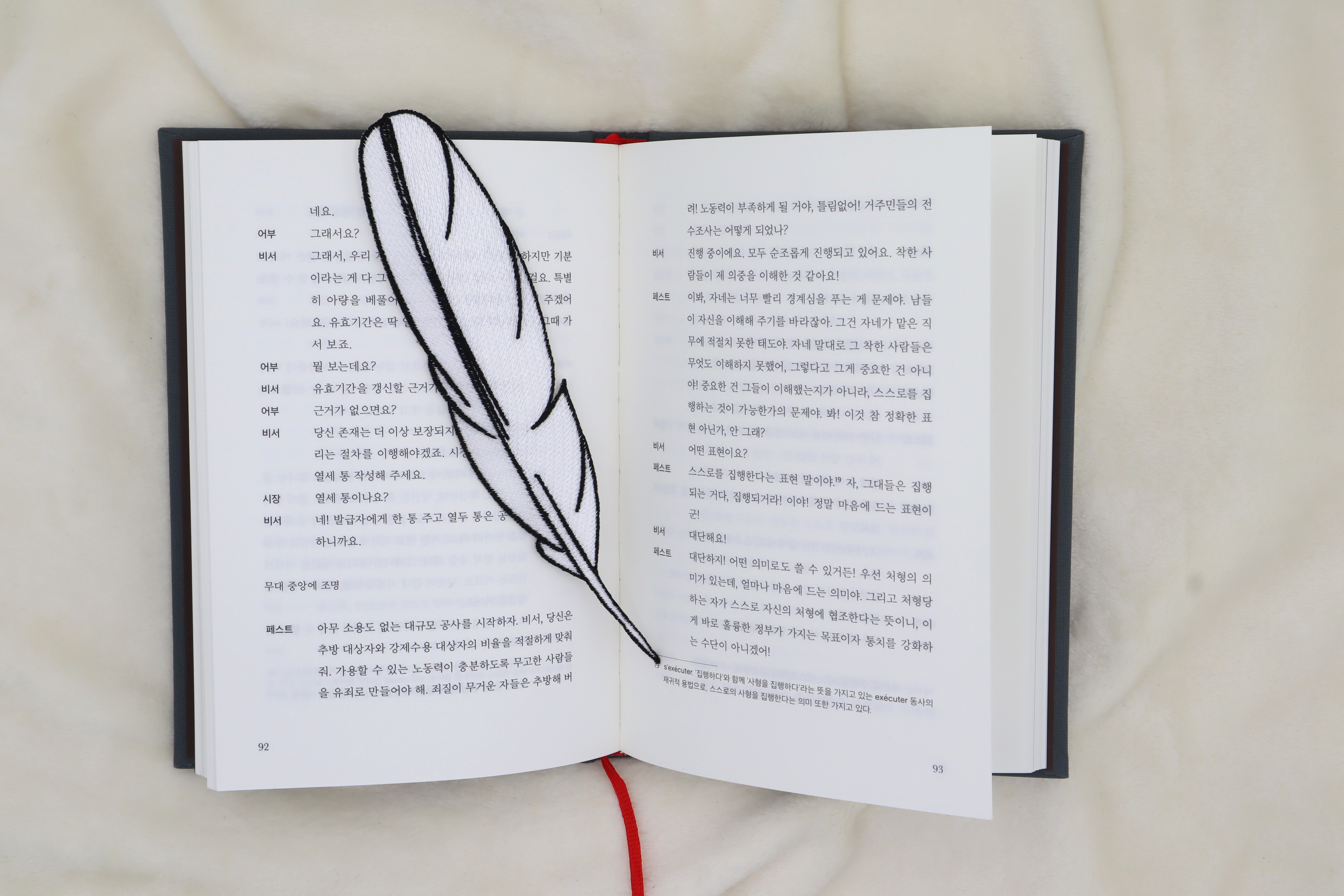 * 한결 오리지널 자수 책갈피입니다. * 도안과 사진의 저작권은 한결기획에 있습니다. 무단 전재 및 도용시 법적 제재를 받을 수 있습니다. * 사진 촬영에 사용된 책은 녹색광선 출판사의 <계엄령(2025)>입니다.